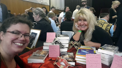 Hier bekomme ich mal Gelegenheit, liebe Kollegen (besser) kennenzulernen, wie Annika Dick, die erstmal Leute mit Lesekatzen-Buchboxen glücklich macht. Gabriele Ketterl hat den Tisch passend zu ihren Venezianischen Vampiren mit Fledermaus-Lakritze dekoriert. Ihre Bücher gehören zum Auftakt der Vampir-Reihe bei Fabylon, in der im kommenden Jahr auch meine „Gnackzuuzler“ erscheinen sollen. Von wegen, das Genre ist ausgelutscht (pun intended)!
