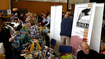 Am Ziel spaziere ich vom menschenleeren Bahnsteig durch den vermatschten Park zum Bürgerhaus – und fühle mich sofort wohl: Einen kleinen Saal gibt es, halb zugestellt mit Ständen, die andere Hälfte bietet Platz für Tische zum Essen und Plauschen. Ich bin, muss ich zu meiner Schande gestehen, noch nie auf der FBM gewesen, nicht mal, als ich noch in Hessen wohnte und die Schülerzeitung meines Vaters regelmäßig dort Preise für die beste Schülerzeitung Hessens verliehen bekam. Sie ist mir schlicht zu groß. Ich schaffe ja kaum die Leipziger Messe, ganz davon abgesehen, dass zum Kontakte-Knüpfen in dem Gewühl kaum Gelegenheit ist. Im Gegensatz zur BuCon. Denn hier springt mir als Erstes der Stand meiner Agentur Ashera ins Auge.