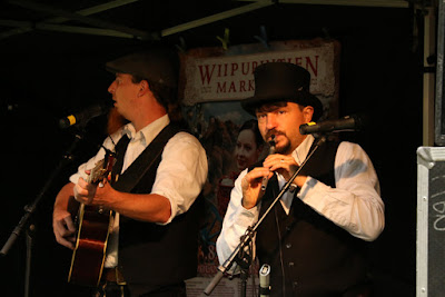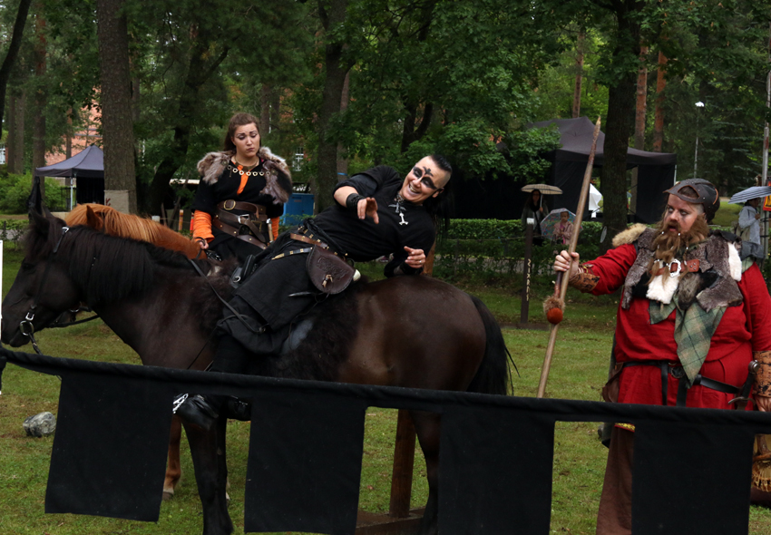 In Kouvola sind wir dann auf der Suche nach einem Supermarkt einem Ritter über den Weg gelaufen, mit Waffenrock, Kettenhaube, Schwert und allem. Nun sind weder Gerd noch ich Fremde in der Szene und ließen uns von dem Recken gleich den rechten Weg weisen zum Markt. Auch im Dauerregen waren wir nicht die einzigen Deutschen dort. Als die Band, die gerade auf der Bühne so mitreißende irische Musik fabrizierte, kurz innehielt, um untereinander das weitere Programm zu beraten, staunten wir nicht schlecht, dass wir sie ausgezeichnet verstehen konnten. „The Sandsacks“ aus Berlin waren uns nur um einen Tag vorangeflogen (und hoffentlich nicht wie wir wegen Überbuchung auf die Schleudersitze geraten, dass es ein reines Wunder war, dass wir doch noch am gleichen Tag nach Helsinki kamen, aber das ist eine andere Geschichte).