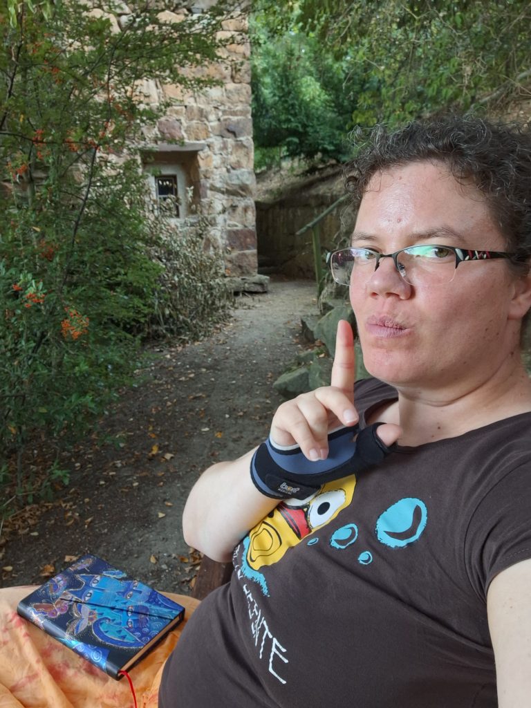 Da es aber so aussieht, als ob mich dererlei gesundheitliche Probleme noch eine ganze Weile begleiten werden, muss ich irgendwohin mit meiner kreativen Energie. Also bin ich, solange das Wetter noch okay war, für einen ersten Text in den Geheimen Park und hab eineinhalb Stunden mit meiner Konzentration und den Formulierungen gekämpft. Allerdings viel erfolgreicher als damals: Eineinhalb Seiten kamen raus. Wahrscheinlich, weil ich mit den Figuren vertraut bin, und über den Teil, der mir schwerfällt, schon hinaus: Setup, dem Etablieren und Entwickeln der Charaktere. Die Handgelenksschmerzen haben mich nach dem Wendepunkt erwischt, wo die Geschichte mit Volldampf auf das Finale zusteuert. Da fällt mir das Diktieren leichter, weil die Szenen ganz klar von meinem inneren Auge stehen.