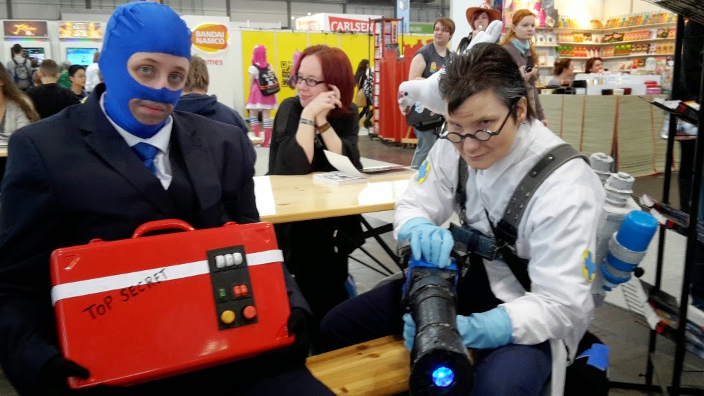 In Halle 1 findet zeitgleich eine Manga-Convention statt. Ein Teil der Besucher schwappt auch in die anderen Hallen. Es ist schon recht amüsant, wenn seltsame rosa Drachenwesen mit Schwanz und Hörnern zwischen den Ständen herumschlendern. Zwischen den ganzen Narutos und Sailor-Moons fallen mir zwei ins Auge, die endlich mal ein bisschen cooler aussehen.