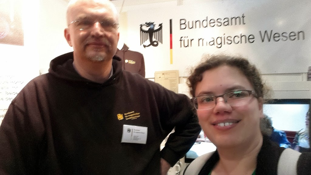 „Textehexe“ Susanne Pavlovic hat gerade ihren neuen Fantasy-Zweiteiler „Feuerjäger“ herausgebracht – nur deshalb zwei Teile, weil ihr Verleger über die schiere Länge des Manuskripts entsetzt war. Eine starke Heldin, die gerne Zwergenschnaps trinkt, der natürlich am Stand nicht fehlen darf. Hier erreicht uns übrigens die traurige Nachricht von Terry Pratchetts Tod. Ich habe nicht viel von seiner Scheibenwelt gelesen, zu eingeschüchtert war ich von der schieren Masse der Bücher, aber ich weiß zum Beispiel, dass einer meiner liebsten Autoren, Neil Gaiman, ihn sehr schätzte – und kenne natürlich die ganzen Referenzen auf seine Kultserie.