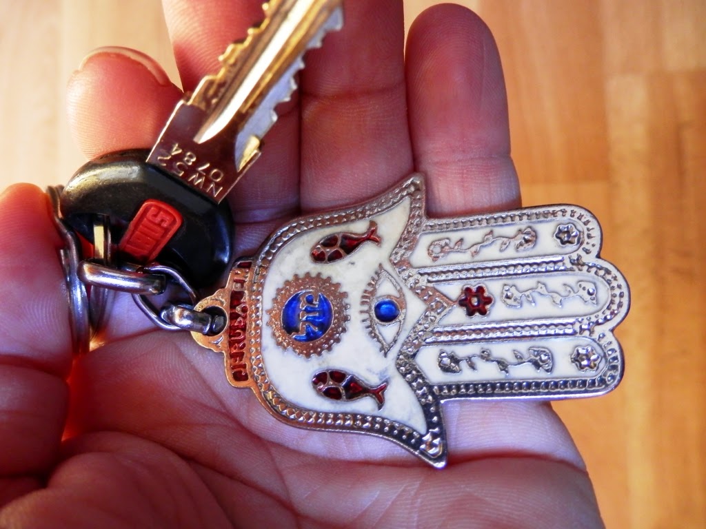 In der Ausstellung über jüdisches Leben in Schwedt kamen wir auf das Thema jüdische Symbole. Und weil ich leider gerade einen solchen Schlüsselanhänger verloren hatte, den mir ein Freund aus New York mitgebracht hatte, fragte ich nach der Hand mit dem Auge. Das, wurde ich von den Israelis aufgeklärt, sei ein Glückssymbol, das im ganzen arabischen Raum verwendet werde, unabhängig von der Religion. Und am Ende des Interviews schenkten sie mir einen neuen Schlüsselanhänger, mit einem hebräischen Reisesegen auf der Rückseite.