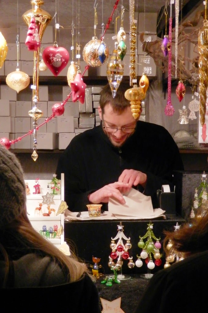 Christian Schmidt preist auf dem deutschen Weihnachtsmarkt Glaskunst an