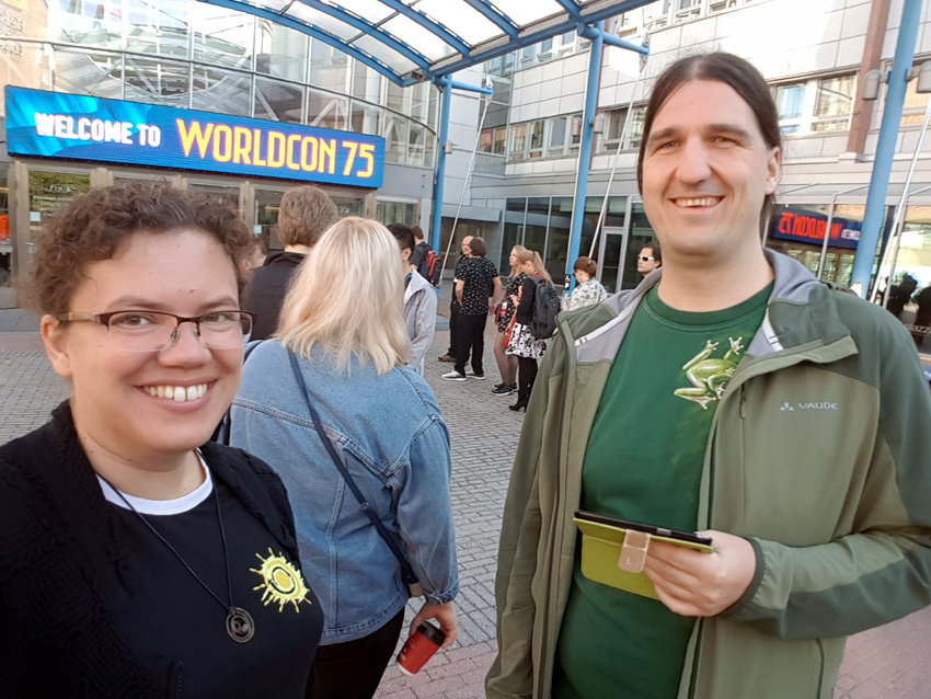 Als wir nach dem ersten Tag der Worldcon online lasen, dass die Veranstaltung wegen Überfüllung nur noch hundert Tagespässe ausgeben werde (neben den bereits vorgebuchten), wurden wir ein bisschen nervös – es wäre schon etwas dumm, wenn der Anlass unserer Reise plötzlich platzen würde. Deshalb taten wir, was gute Fans tun: Uns eine Stunde vor Öffnung in die Schlange stellen und sichergehen, dass wir noch reinkommen.